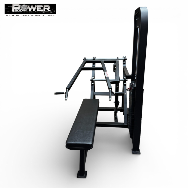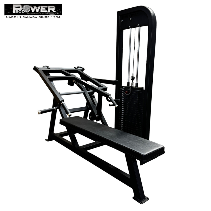 The Power Body #3070 Selectorized Bench Press offers the familiarity of a traditional bench press with the added security of a guided weight stack.