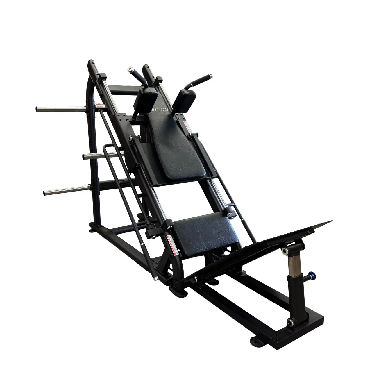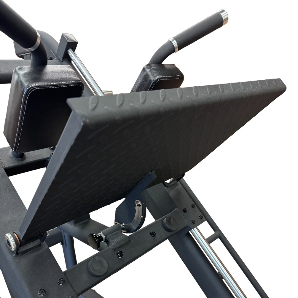 - Adjustable footplate in hack squat position; Hack squat Footplate measures 29″ x 30″W
